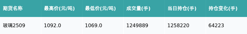 南财智讯5月7日电,南财金融终端盘后期货数据显示,郑州商品交易所的玻璃主力合约收涨0.09%,收盘报1074.0元/吨无忧配,日内资金流出7.33亿元。其他相关指标见下表: