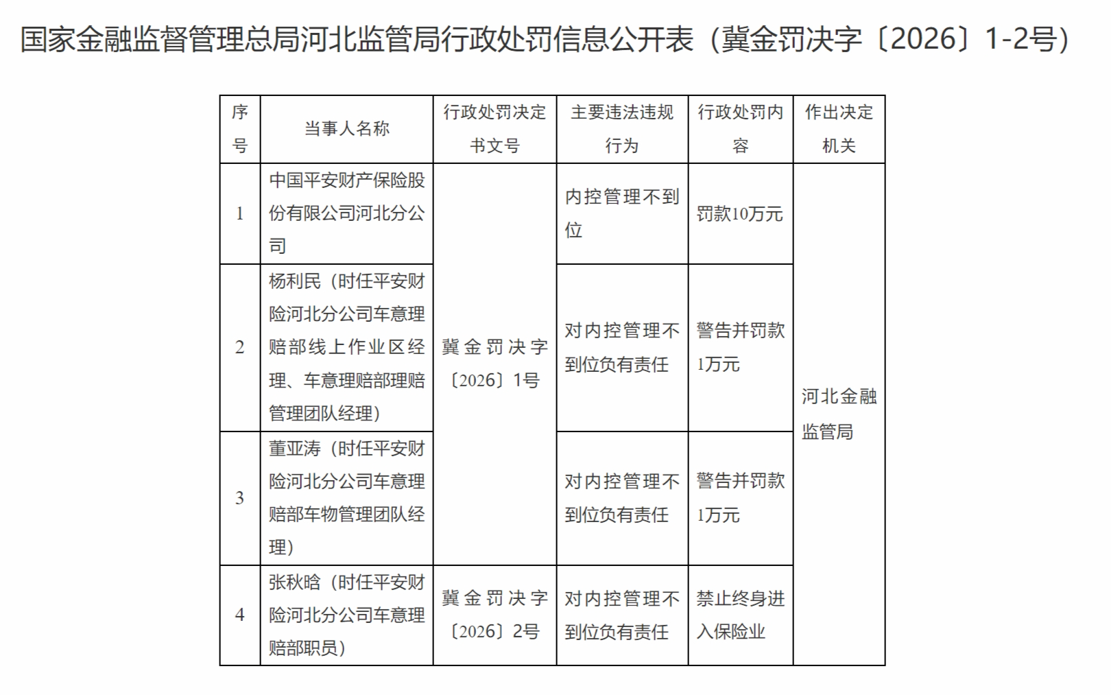 1月20日,国家金融监督管理总局河北监管局行政处罚信息公开表(冀金罚决字〔2026〕1-2号)显示,中国平安财产保险股份有限公司河北分公司,内控管理不到位,被罚款10万元。