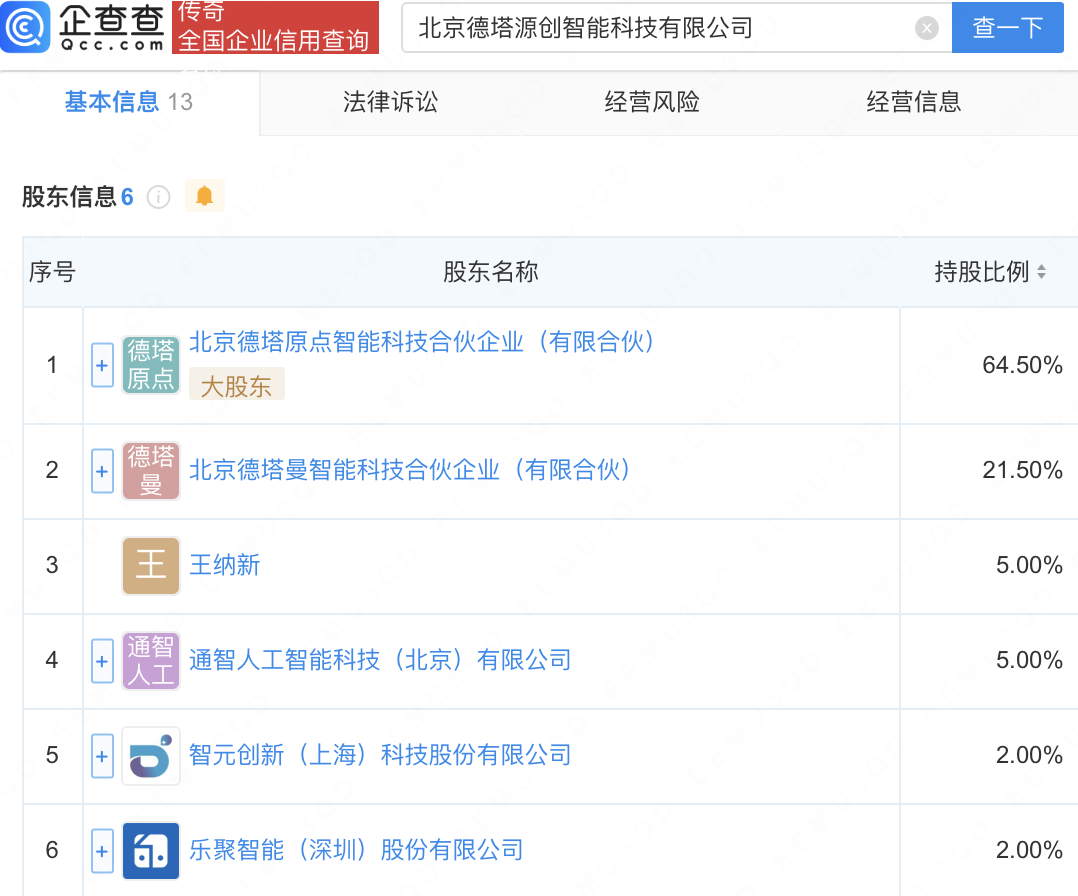 近日,北京德塔源创智能科技有限公司成立,经营范围包含:人工智能应用软件开发;计算机系统服务;市场调查(不含涉外调查);智能机器人的研发;智能机器人销售等。企查查股权穿透显示,该公司由智元机器人关联公司智元创新(上海)科技股份有限公司、乐聚机器人关联公司乐聚智能(深圳)股份有限公司等共同持股。